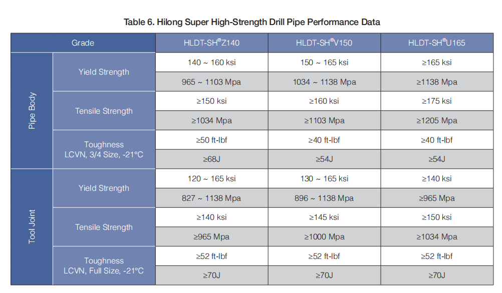 Hilong super high-strength steel grades HLDT-SH®Z140, HLDT-SH®V150 and HLDT-SH®U165 are proprietary products which designed specifically for deep and ultra-deep wells, extended reach drilling (ERD) wells, deep offshore and other critical drilling applications. With a special chemistry composition and carefully designed heat treatment process, HLDT-SH®Z140, HLDT-SH®V150 and HLDT-SH®U165 grades have realized high strength, high toughness and improved fatigue resistance.