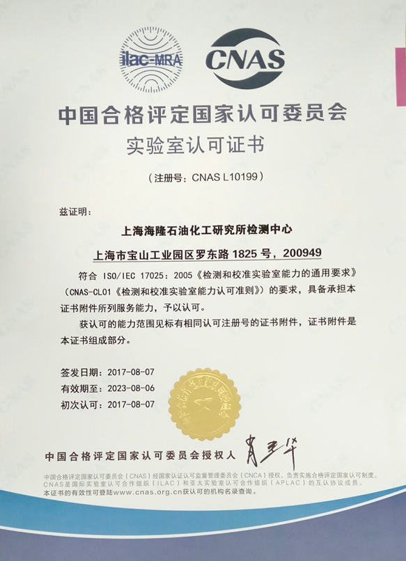 (2017年9月11日,上海)上海海隆石油化工研究所順利通過中國合格評定國家認可委員會(CNAS)現(xiàn)場評審,于近日正式獲得CNAS認可資格證書(注冊號:CNAS L10199)。該證書的獲得表明化工研究所已建立了比較完善的管理體系,能夠滿足《檢測和校準實驗室能力認可準則》的要求;同時標志著化工研究所出具的報告,具備了在全球53個國家和地區(qū)相互承認的資格.