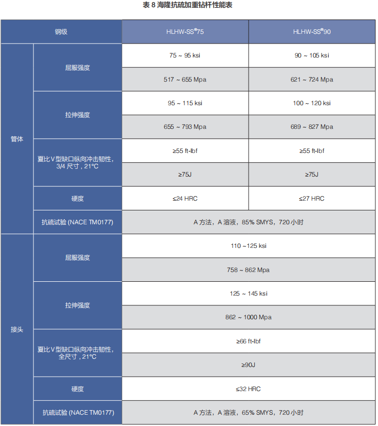 表 7 海隆抗硫鉆桿性能表