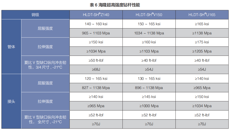海隆超高強(qiáng)度鉆桿是一種適用于深井,超深井 , 大位移井等苛刻鉆井環(huán)境的專有產(chǎn)品,具有高強(qiáng)度、高韌性、高抗疲勞能力。通過采用特殊的材質(zhì)及嚴(yán)格的熱處理工藝控制,使其在強(qiáng)度提高的同時(shí),還具備良好的沖擊韌性。